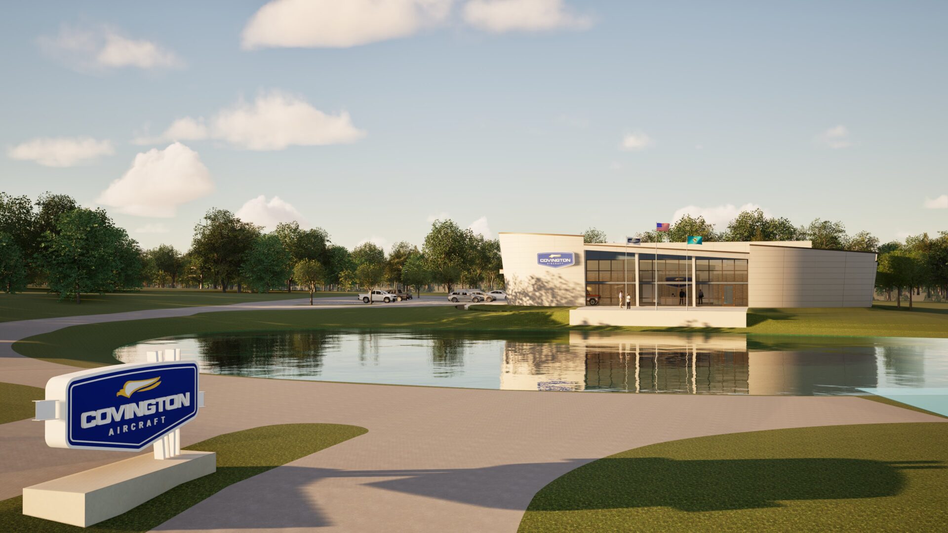 This new corporate headquarters is being developed for Covington Aircraft, an aviation maintenance company based in Okmulgee, Oklahoma. Positioned along a major highway, the building creates a distinctive and welcoming corporate front door for the organization.